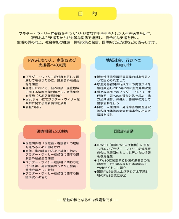 「日本プラダー・ウィリー症候群協会 ( 略称PWSA Japan )」は、 プラダー・ウィリー症候群をもつ人たちとその家族や支援者でつくる会員組織です。